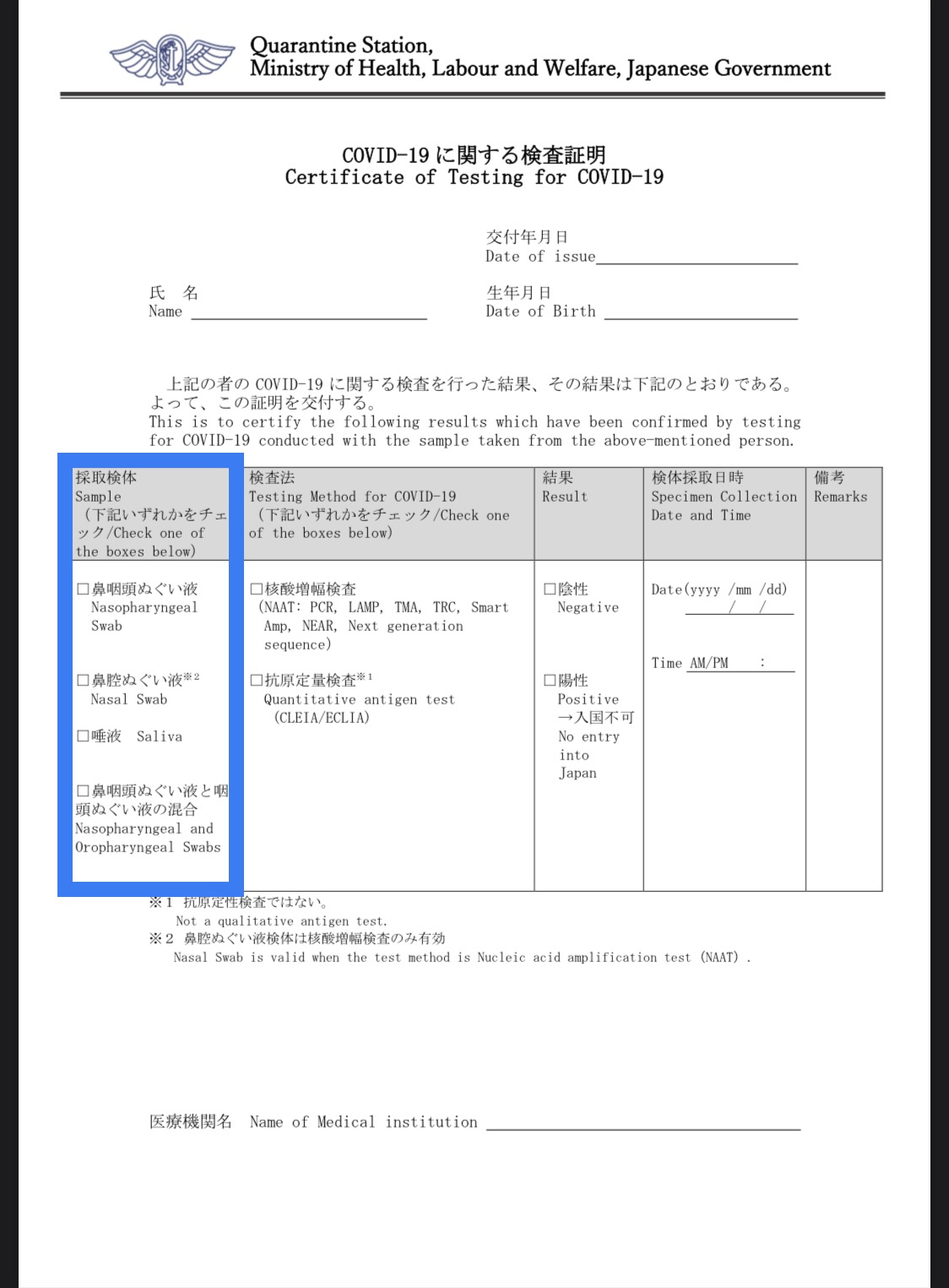 陰性証明:日本に帰国するために必要な書類 一部認められていない検査もあります。