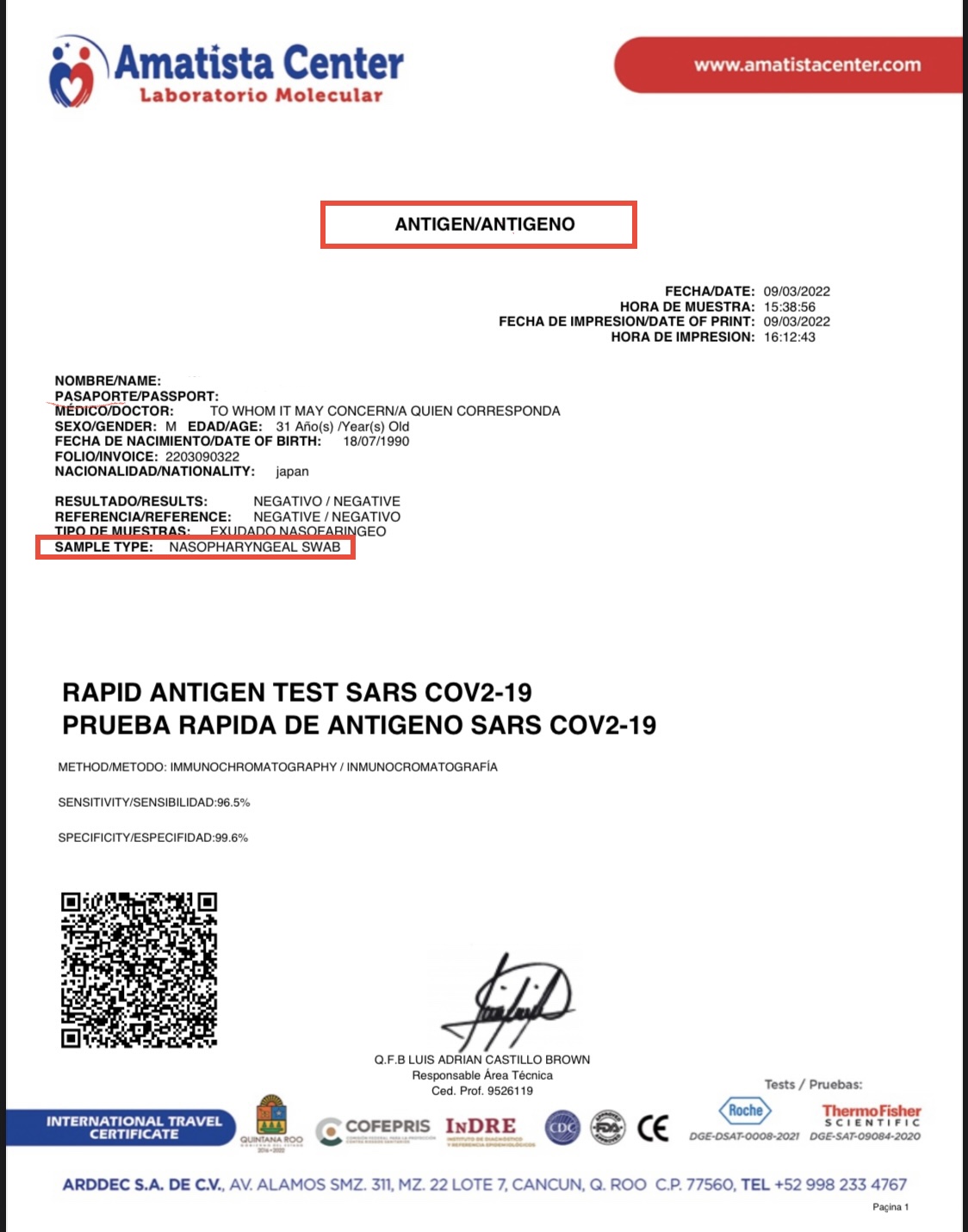 大事なことは、出国の72時間前に、フォーマットに沿った採取検査で、記載された検査法を行い、結果がnegativeの判断されているかです。
