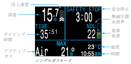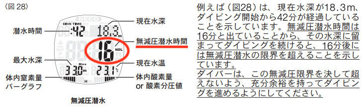 「あと何分潜っても安全に浮上できるか(NDL:減圧不要限界時間)」を画面に表示します。