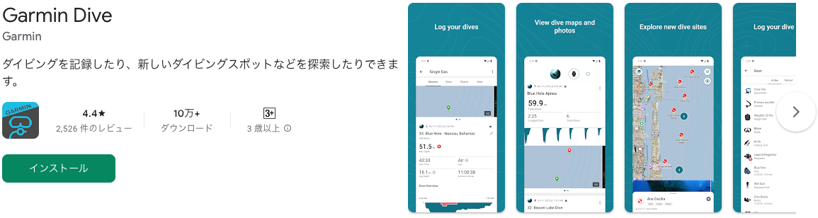 - ログ情報:ダイブ後に自動保存され、スマホに転送可能。