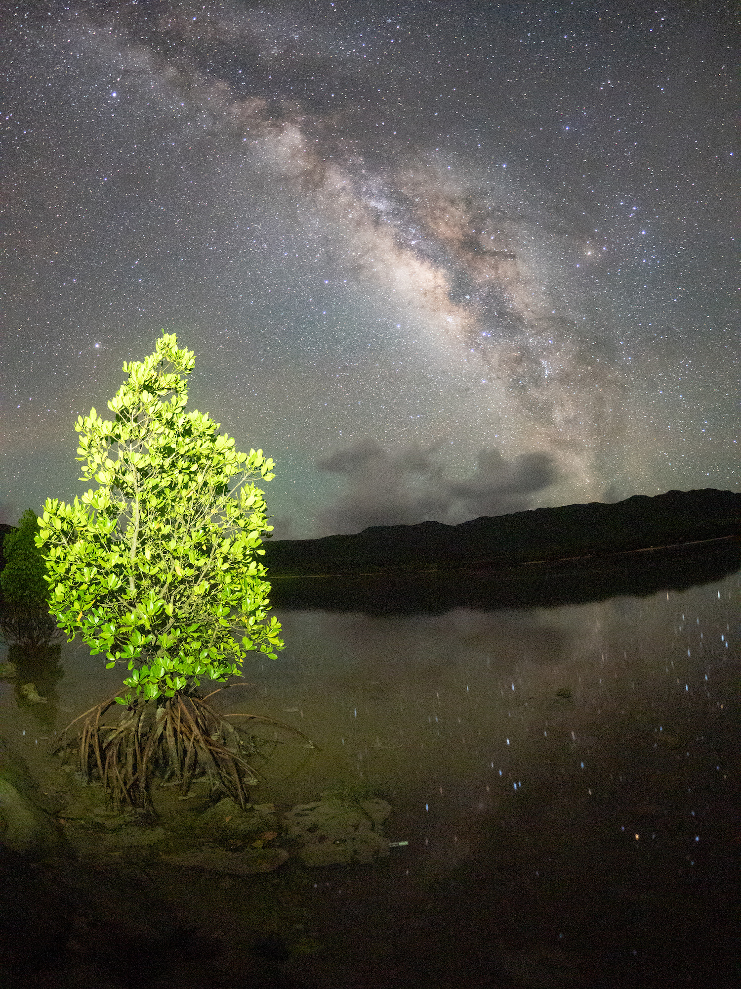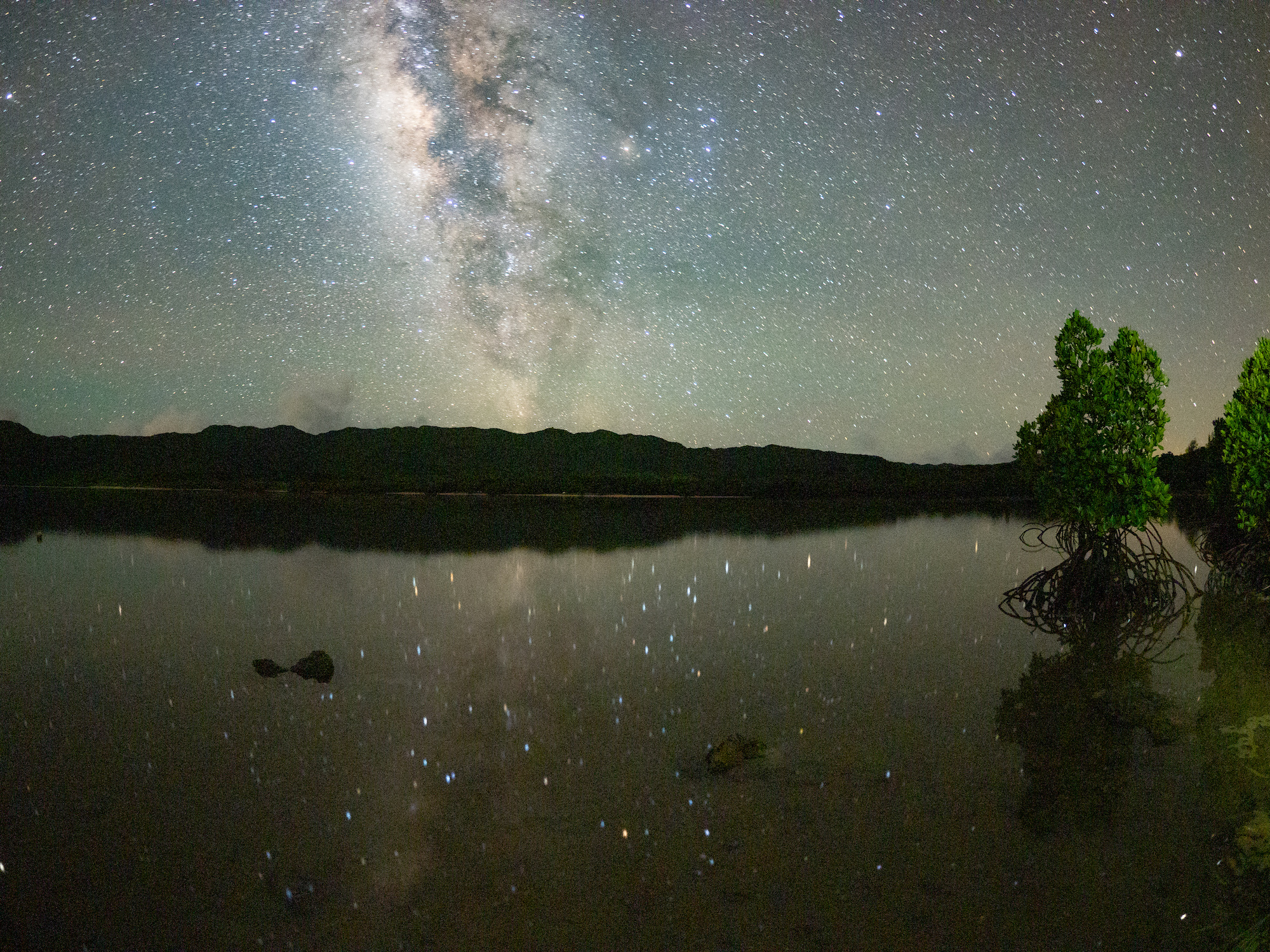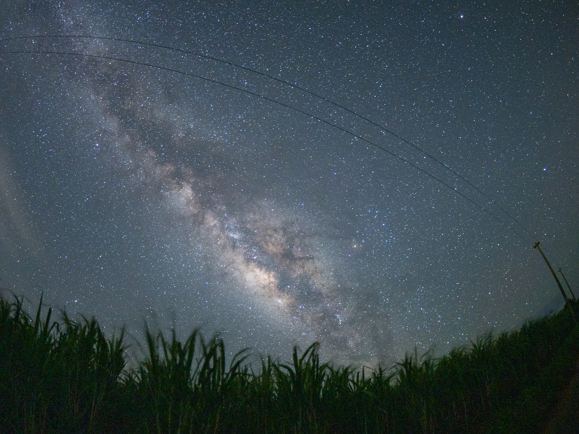 少し高台から撮影できたので、沖縄の低い山の上に天の川が綺麗に写っています。