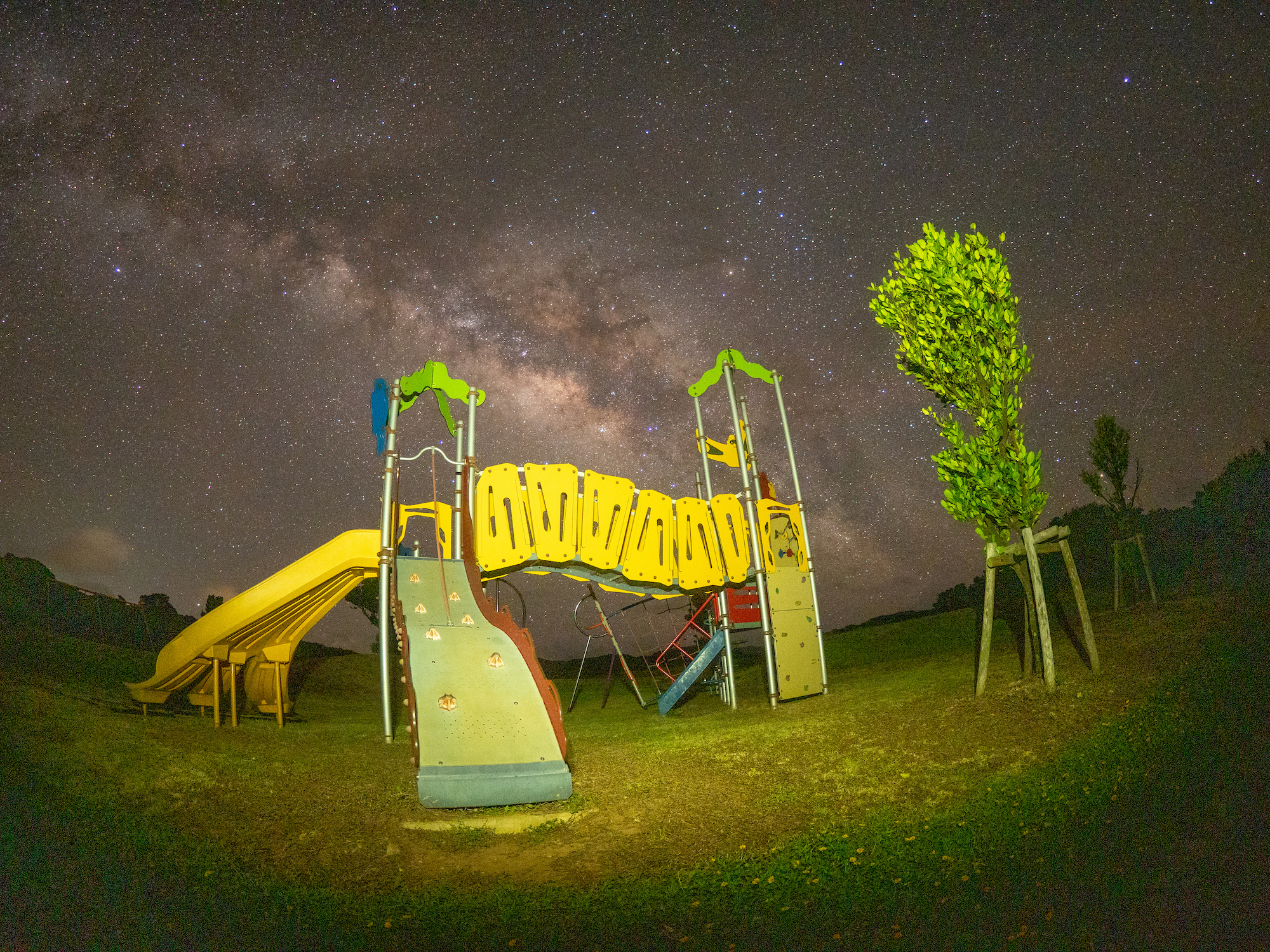 公園の滑り台と一緒に撮影した天の川。構造物があることで、空のスケール感も伝わってきます。