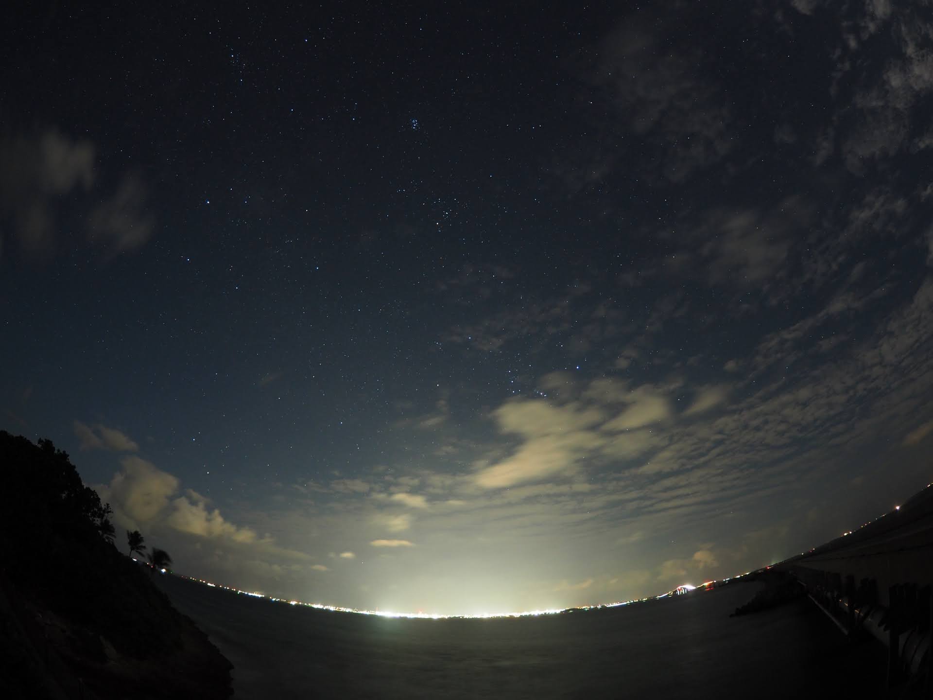 水平線の先に見える光は、宮古島の市街地の街灯です。この光の影響で、星空も思うように撮影できません。