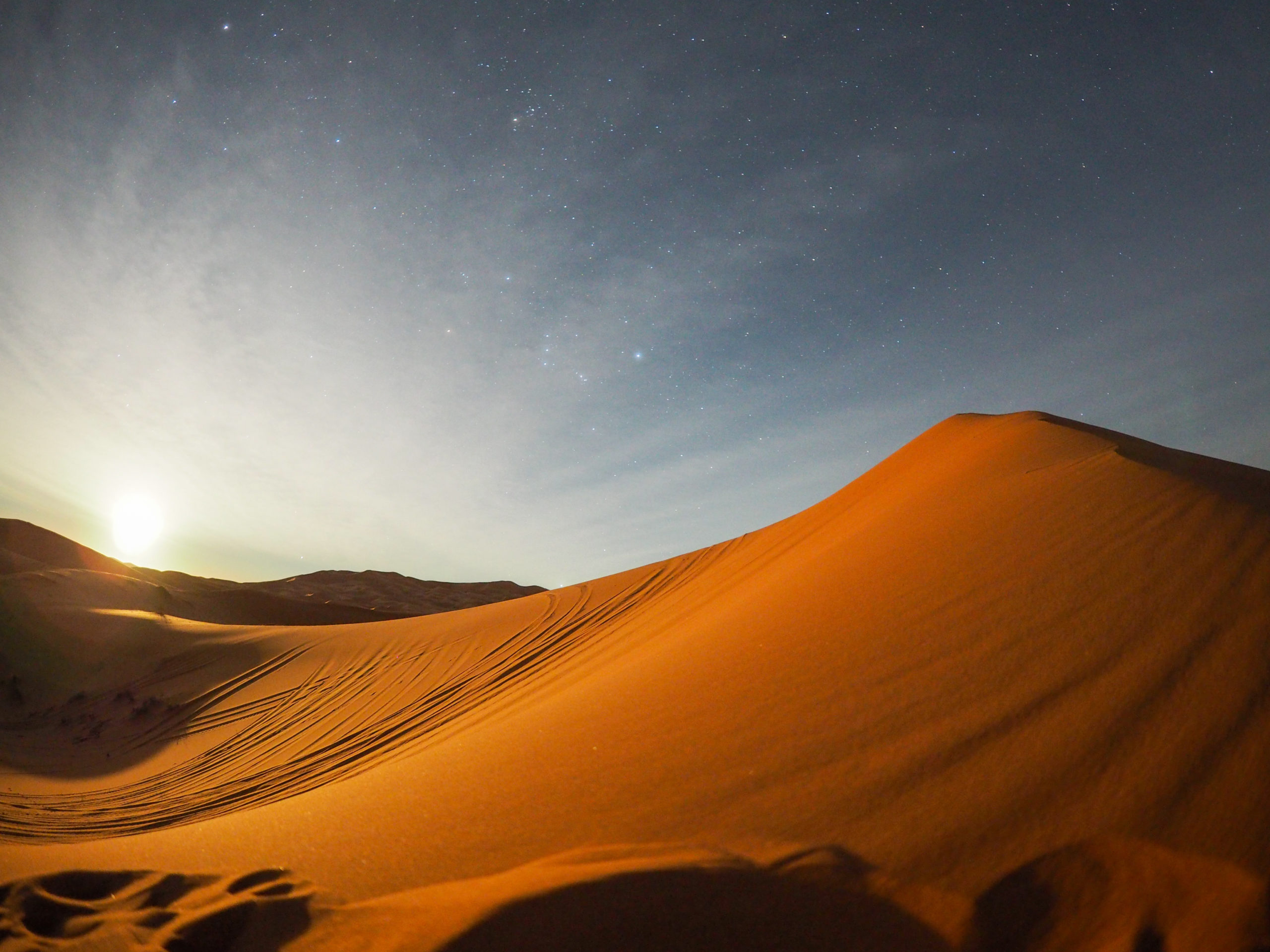 左にある光の玉は満月です。いい感じに砂漠を照らしてくれていますが、星空はほぼ見えない写真となってしまいます。オリオン座だけ写っていますが…