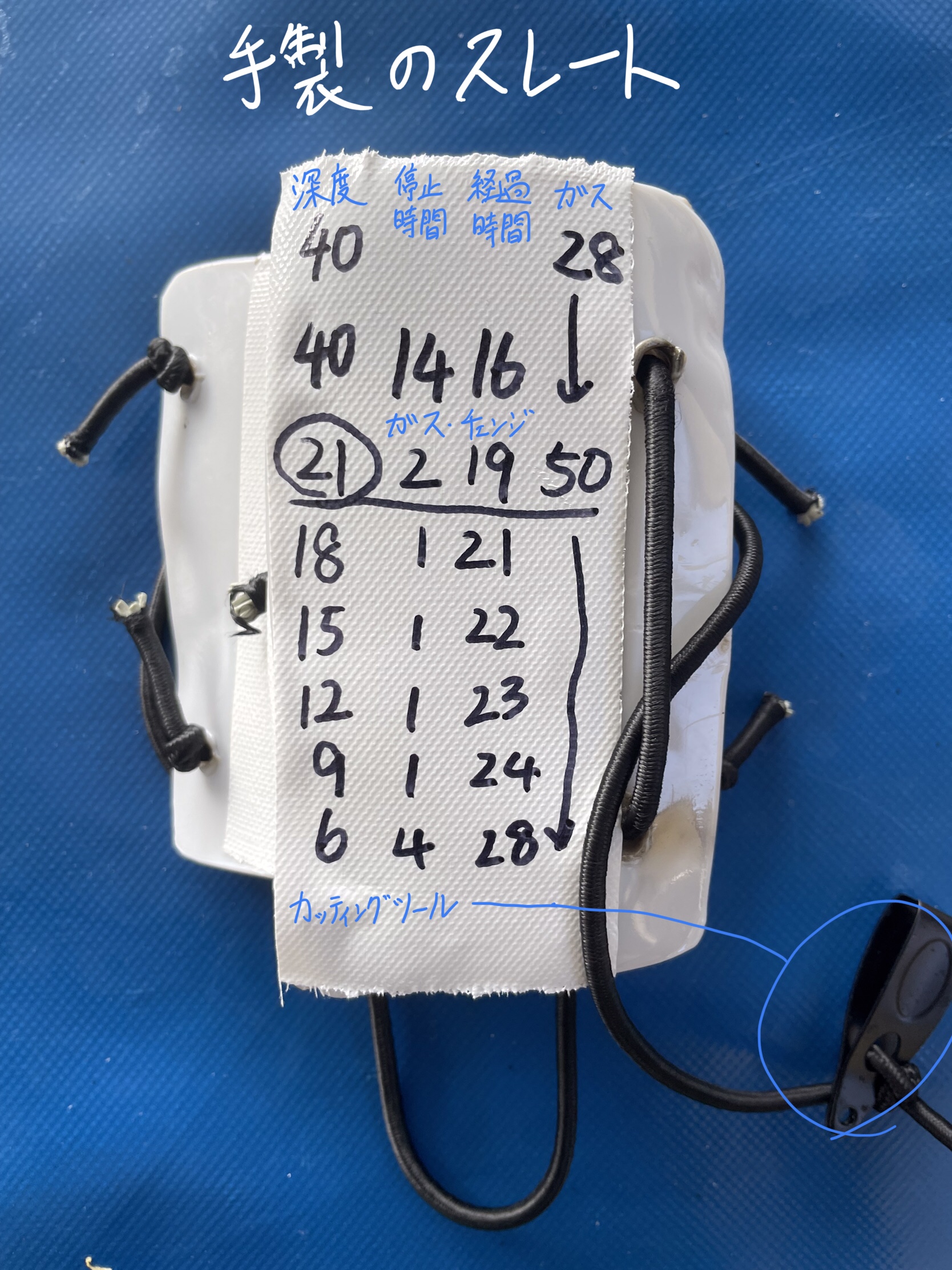 なぜこのタイミングかというと、実際に計測した酸素濃度でプランが微妙に変わってくるからです。 ガス交換のタイミングが○m、減圧のために○mに□分停止等。 計算が複雑なので、アプリを使用します。 Malti DECO という、アプリを使用します。