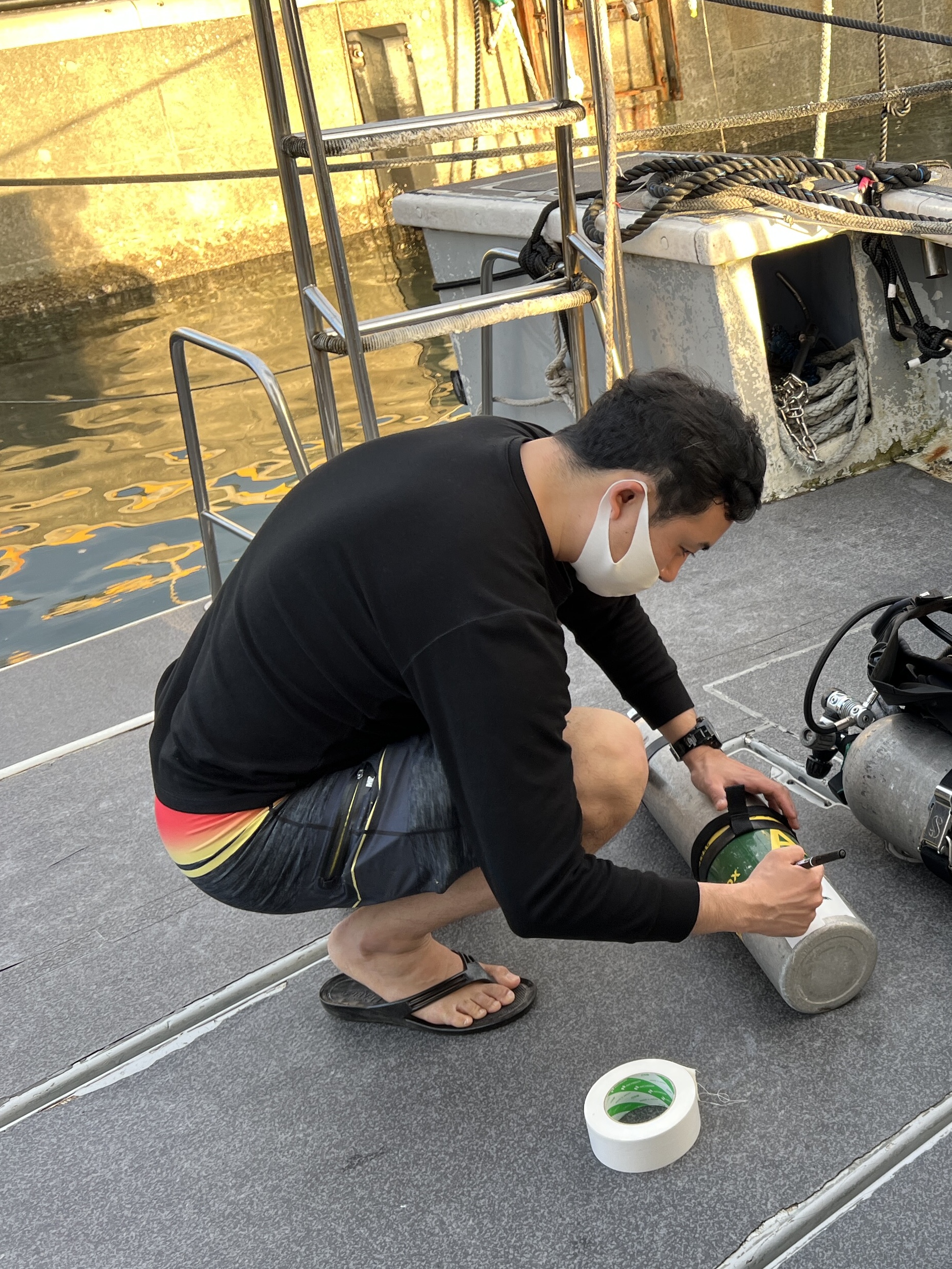 2. シリンダーに名前、酸素、MOD(Maximum Operating Depth)日付の記載